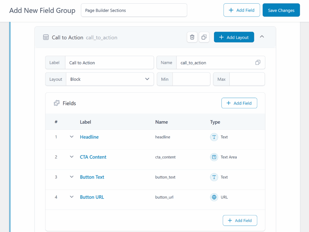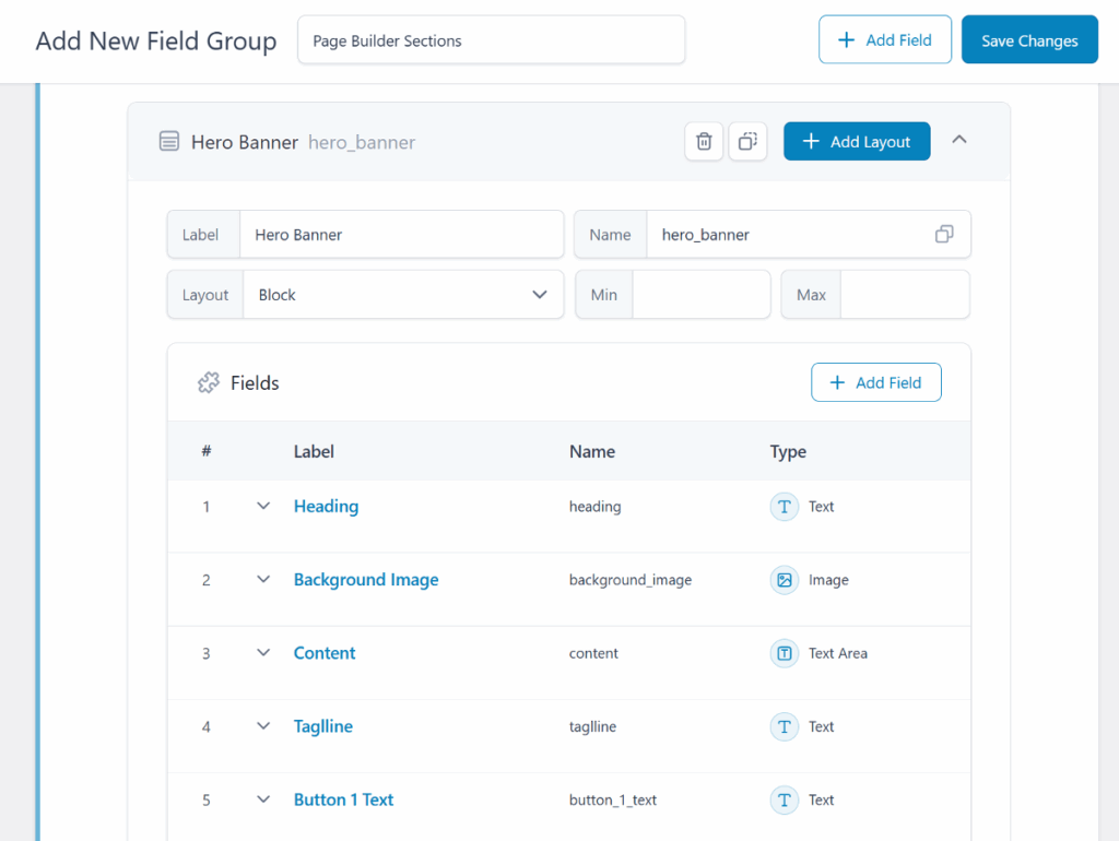 First, we need to set up the backend structure in ACF. This is where we’ll define the different content blocks, or layouts, that our content editors will use.