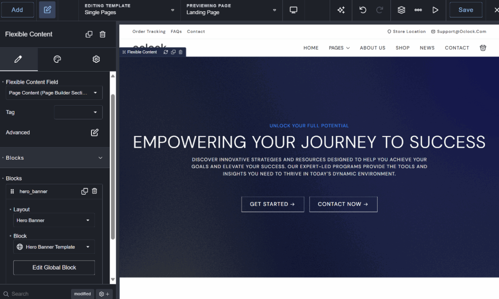That’s it! Now, when you visit any WordPress page, Breakdance will automatically check for content in your Flexible Content field. It will loop through each layout a user has added and render it using the beautiful Global Block template you designed. This creates a seamless, dynamic system where your content editors can build pages, and the design always looks perfect.