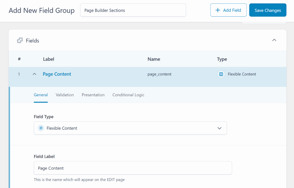 Once you’re done, click Save Changes. You’ve now successfully created a Flexible Content field. If you edit any page, you’ll see your new block-based editor, ready for content.