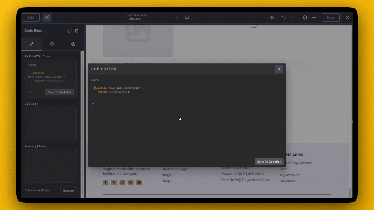 When working in Code areas in Breakdance, you’ll now be able to send the code to WPCodeBox. This option will be available for the following areas: